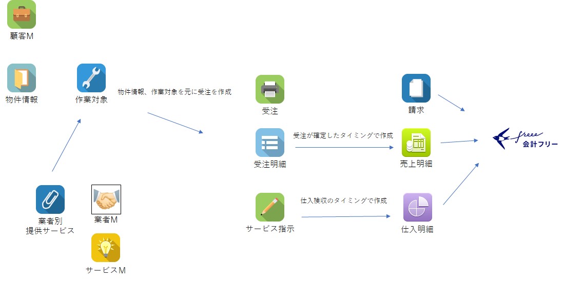 顧客情報、サービス情報、物件情報、受注情報から仕入や請求までを管理する、結構ヘビーな内容となりました。